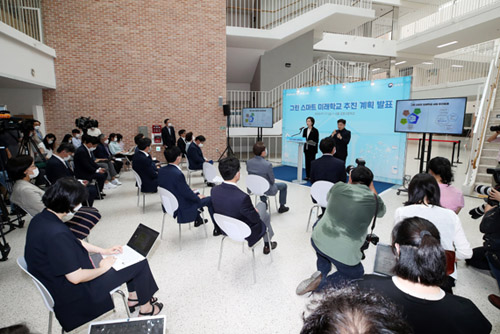 | 유은혜 사회부총리 겸 교육부 장관이 지난 7월 17일 오후 그린스마트스쿨 시범 학교인 서울 강서구 공항고등학교에서 열린 그린스마트 미래학교 추진계획 발표회에서 그린 스마트 미래학교 추진관련 현장 브리핑을 하고 있다. |