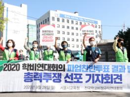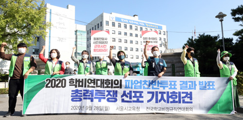 | 전국학교비정규직연대회의 조합원들이 지난 9월 28일 오전 2020년 학교비정규직연대회의 파업 찬반투표 결과 발표 및 총력투쟁 선포 기자회견을 하고 있다. |