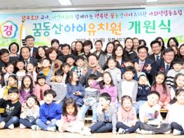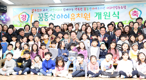 | 2019년 3월 12일 오전 전국 최초 부모협동조합형 유치원으로 개원한 서울 노원구 상계동 '꿈동산아이유치원' 에서 조희연 서울시교육감과 교사, 원생, 참석자들이 기념촬영을 하고 있다. |