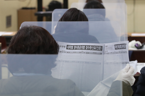 | 구랍 4일 오후 서울 강남구 종로학원에서 열린 2021학년도 대학수학능력시험 합격 예측 점수 설명회에서 학부모들이 칸막이를 사이에 두고 거리두기를 하며 앉아 대학별 영어 등급대별 점수환산표를 보고 있다. |