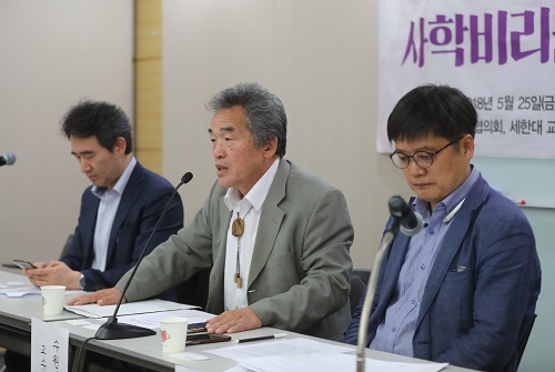 지난 2018년 5월25일 오전 서울 서초구 서울지방변호사회관에서 열린 5개대학(동신대, 세한대, 수원대, 영산대, 청암대) 교수협의회 기자회견에서 이원영(가운데) 수원대학교 교수협의회 공동대표가 검찰의 사학비리 비호 관련 사례 등을 발언하고 있다.