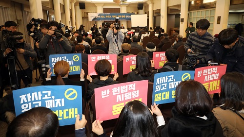 사회정의를 바라는 전국교수모임 주최로 6일 오후 '문재인 정부의 외교, 자사고, 국제고 폐지 반대 정책 토론회'가 열린 서울 중구 프레스센터에서 참석자들이 자사고, 외교 폐지 반대 피켓을 들고 있다.