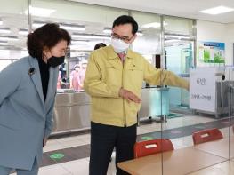 정종철 교육부 차관이 15일 충북 청주 오송중학교를 방문해 급식실 방역 현장점검을 하고 있다.