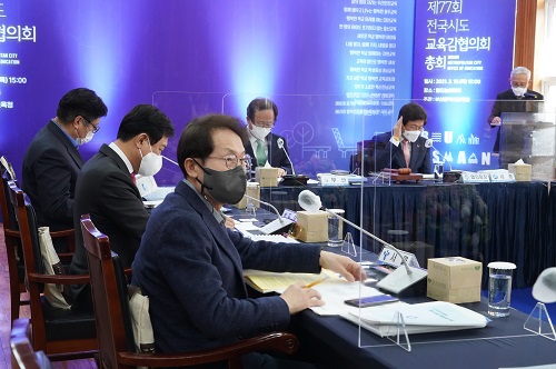조희연 서울시교육감이 18일 오후 부산 영도놀이마루에서 열린 제77회 전국시도교육감협의회 총회에 참석하고 있다. 개학 후 첫 대면 총회에서는 코로나19 학교 방역을 비롯한 교육계 주요 현안이 논의되었다.