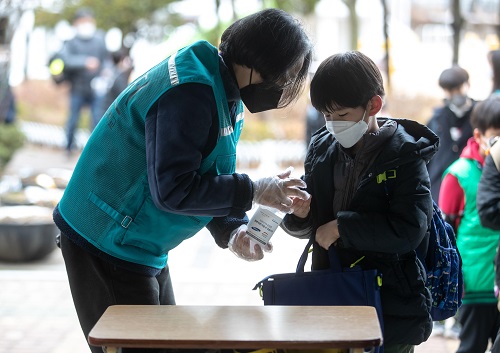 2021학년도 첫 등교를 시작한 2일 오전 서울 강남구 서울포이초등학교에서 초등학생들이 학교로 들어가며 손소독을 하고 있다.