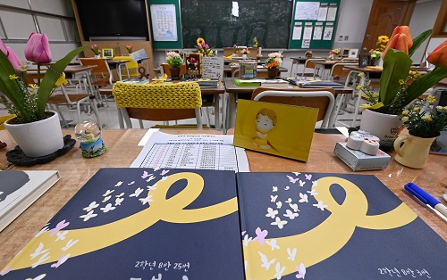 세월호 참사를 나흘 앞둔 12일 오후 경기도 안산시 단원구 4.16민주시민교육원 단원고 4.16기억교실에 희생자들의 추모품이 놓여 있다. 2021.04.12.