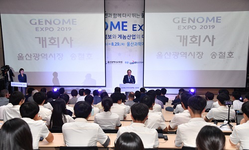울산시와 울산시교육청, 울산정보산업진흥원, 울산과학기술원(UNIST)는 28일 오후 울산 UNIST대 제4공학관에서 ‘게놈 엑스포 2019’ 행사에서 송철호 울산시장이 인사말을 하고 있다. 2019.08.28.