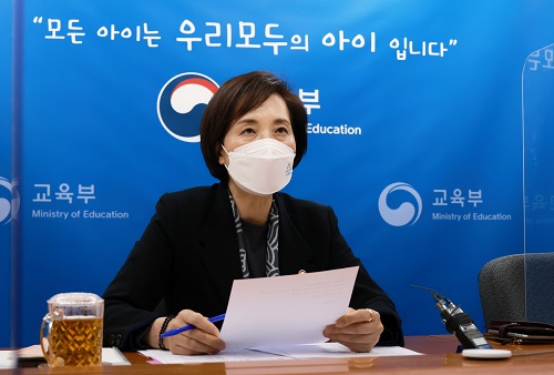 유은혜 부총리 겸 교육부 장관이 서울-세종 간 영상으로 열린 제19차 교육신뢰회복추진단회의에 참석해 발언하고 있다. (사진=교육부 제공) 2021.04.19.