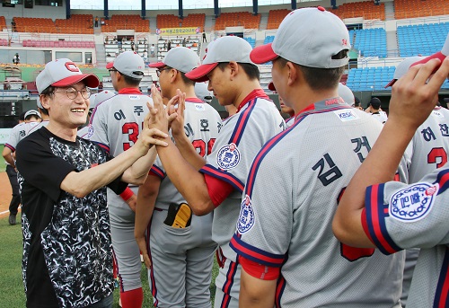 조희연 서울시교육감이 지난 2019년 서울 양천구 목동야구장에서 열린 제47회 봉화대기 전국고교 야구대회 개막전에 참석, 충암고 선수들과 하이파이브를 하고 있다. 2019.08.10.(사진=서울시교육청 제공)