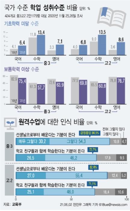 2일 교육부가 발표한 '2020년 국가수준 학업성취도 평가 결과'에 따르면 중3과 고2 전 과목에서 기초학력 미달 학생이 전년 대비 늘어난 것으로 확인됐다. 보통 이상의 수준에 해당되는 학생 비율도 줄었다.