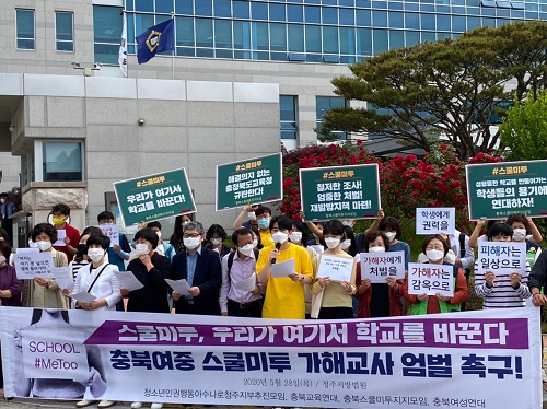 충북스쿨미투지지모임은 28일 청주지방법원 앞에서 스쿨미투 관련 기자회견을 하고 있다. (사진 = 충북스쿨미투지지모임 제공) 2020.05.28.