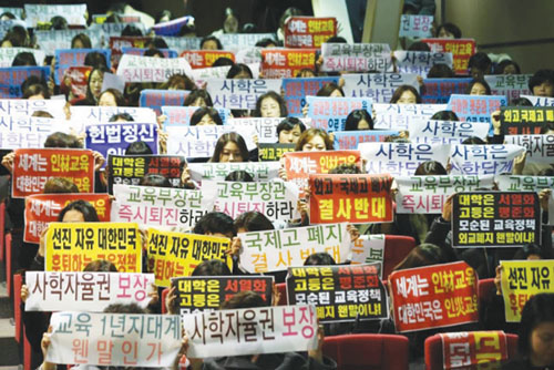 | 자사고, 외고, 국제고 교장연합회와 학부모들이 지난해 12월 18일 이화여자외국어고등학교에서 기자회견을 열고 이들 학교의 일괄폐지를 규탄하고 있다. |