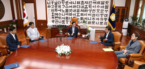 | 박병석(가운데) 국회의장을 비롯한 시도교육감들이 20일 오전 서울 여의도 국회 국회의장 집무실에서 '전국시도교육감협의회 교육정책 간담회'에서 대화를 내누고 있다. 왼쪽부터 장석웅 전남교육감, 도성훈 인천시교육감, 박병석 국회의장, 최교진 세종시교육감, 조희연 서울시교육감. |