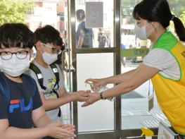 | 지난 6월 8일 오전 코로나19 사태 후 4차 등교한 울산 남구 월계초등학교 학생들이 교실입구에서 손 소독을 하고 있다. |