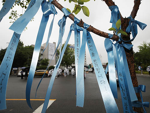 | 국제중학교 지정 취소 처분을 받은 대원·영훈국제중학교 학부모들이 지난 7월 25일 오전 서울 종로구 신문로 서울시교육청 앞에서 집회를 열고 취소 철회를 촉구하는 가운데 영훈국제중학교를 상징하는 하늘색 리본이 걸려 있다. 이 리본은 학부모들이 매달았다. 서울시교육청은 이날 대원·영훈국제중학교의 입장을 듣는 청문 절차를 진행한다. |